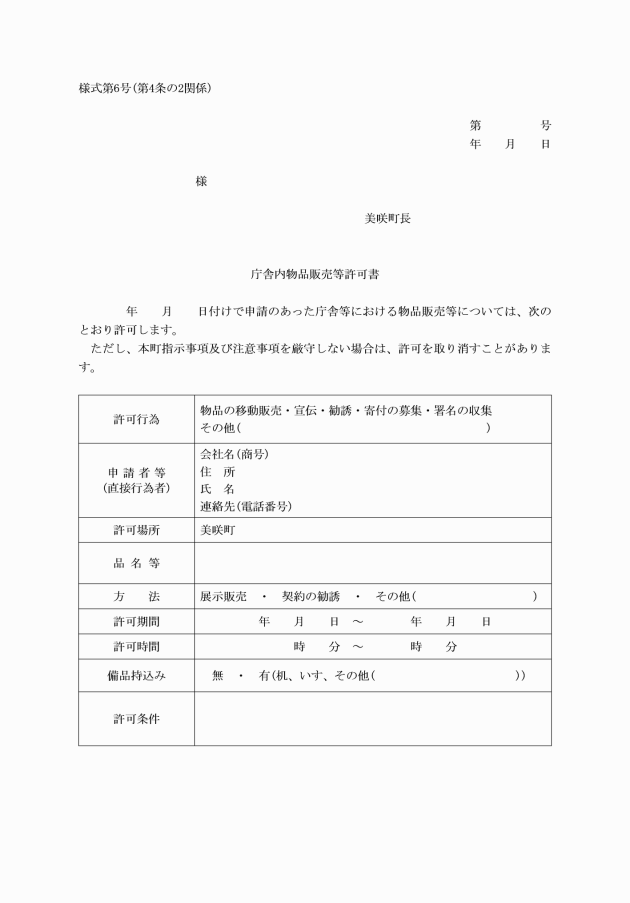 3 庁内販売等の許可の終期は当該申請日の属する年度の末日とする。ただし、年度の途中で庁内販売等が終了する場合は、許可期間終了日までとする。