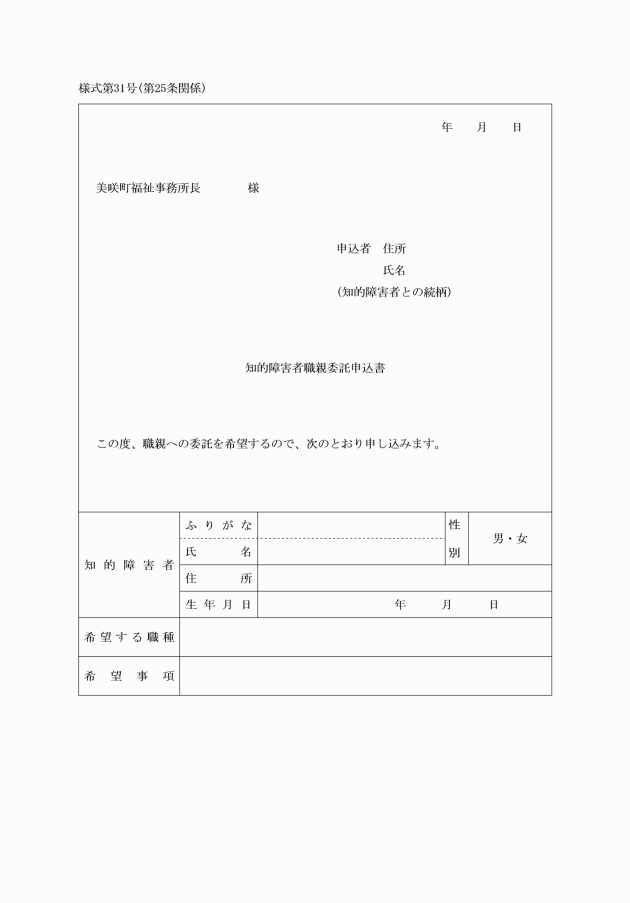 第25条 知的障害者は職親への委託を希望するときは、知的障害者職親委託申込書(様式第31号)を町長に提出しなければならない。