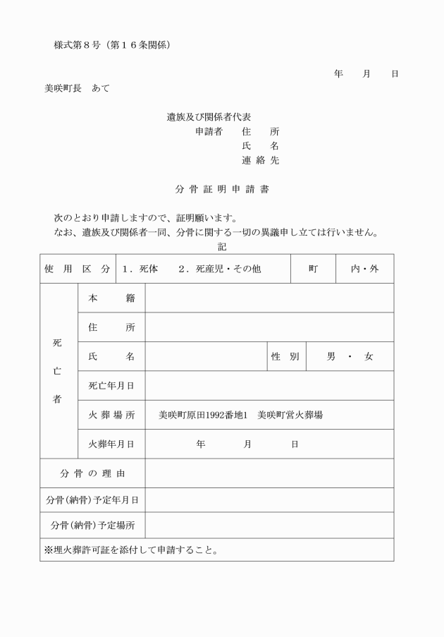 第16条 使用者は、焼骨の分骨を埋蔵し、又は収蔵を委託しようとするときは、火葬に付する前に分骨証明申請書(様式第8号)を町長に提出しなければならない。