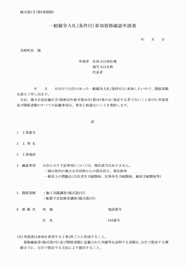 第8条 落札候補者は、一般競争入札(条件付)参加資格確認申請書(様式第1号)、施工実績調書(様式第2号)、配置予定技術者等調書(様式第3号)、資格確認書(様式第4号)及び関係書類(以下「申請書等」という。)を公告で指定する期限までに、公告で指定する方法により提出しなければならない。ただし、町長が必要があると認めるときには、落札候補者以外の入札者に対しても申請書等の提出を求めることができるものとする。