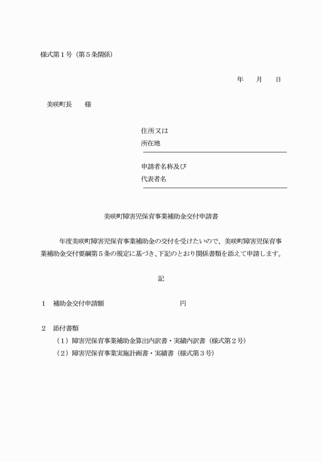 第5条 補助金の交付申請をしようとする者は、美咲町障害児保育事業補助金交付申請書(様式第1号)に次に掲げる書類を添えて、町長に提出しなければならない。