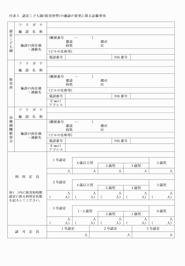 第3条 法第32条第1項の規定により、特定教育・保育施設の確認の変更を受けようとする者は、府令第31条の規定に基づき、特定教育・保育施設確認変更申請書(様式第3号)を町長に提出しなければならない。