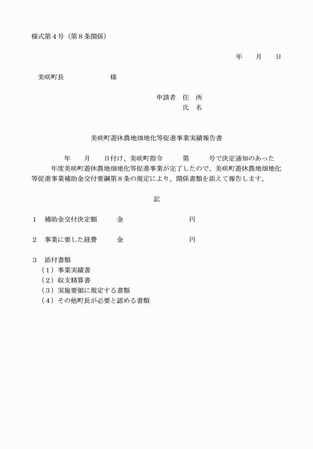 第8条 補助事業者は、補助事業を当該年度の2月末までに完了させ、速やかに、美咲町遊休農地畑地化等促進事業実績報告書(様式第4号)に関係書類を添付し、町長に提出しなければならない。