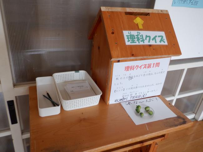 緑の小さな実は、なんだ?早速、回答をポストに入れている5年生たちを見つけました。さて、正解は?