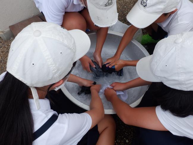 6年生がくつしたを洗いました。もみ洗いやつまみ洗いをして、汚れを落としました。洗剤の量や洗い方、干し方など、いろいろなパターンで挑戦し、どんな方法が適しているのかを考えました。洗濯機と比べて、汚れの落ち具合はどうだったのでしょうか?和やかな洗濯風景でした。