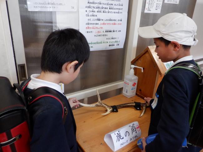 待っていました。理科クイズの登場です。「鹿の角」をのぞき込む子どもたち。さて、この鹿の年齢は、何歳でしょう?進んでクイズに参加する児童が増えてきました。
