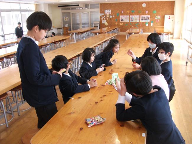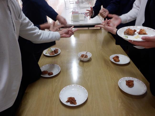 今日の献立は、「牛乳、麦ごはん、とり肉のから揚げ、ポテトサラダ、みそ汁」でした。6年生が家庭科の授業で考えてくれた献立です。栄養バランス、彩り、旬の野菜を使うことなどを取り入れて考えてくれました。どの学年も喜んでモリモリ。6年生教室では、からあげじゃんけんが始まりました。